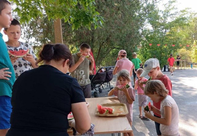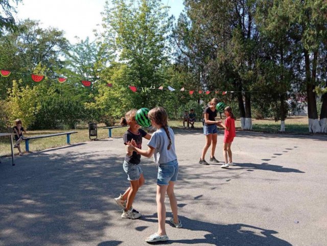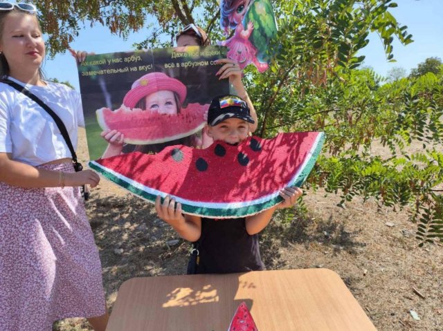 А в окупованому Ольгиному Горностаївського «муніципального округу» діти змагались у поїданні кавунів на час та малювали їх на асфальті. Кому точно не до святкування, то це тим, хто ті кавуни вирощує.