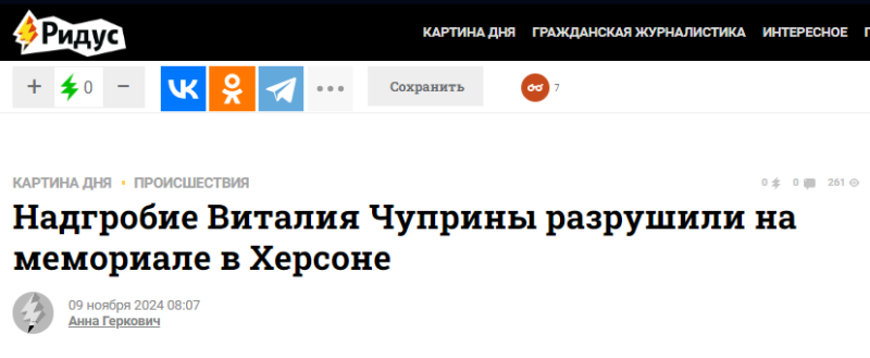 «Надгробок на могилі українського націоналіста та учасника так званої «антитерористичної операції на Донбасі» Віталія Чуприни, похованого на меморіалі воїнам Великої Вітчизняної війни у Херсонській області, зруйнували», – пишуть російські медіа.