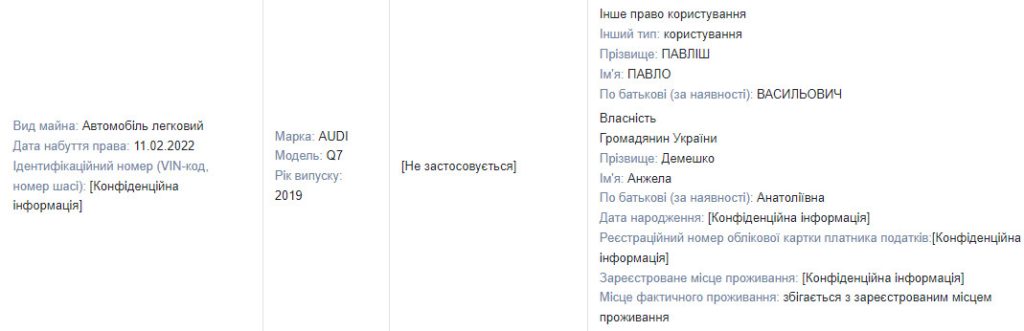 З нових активів у декларації Павліша також можна помітити отриманий 11 лютого 2022 року у користування автомобіль Audi Q7.