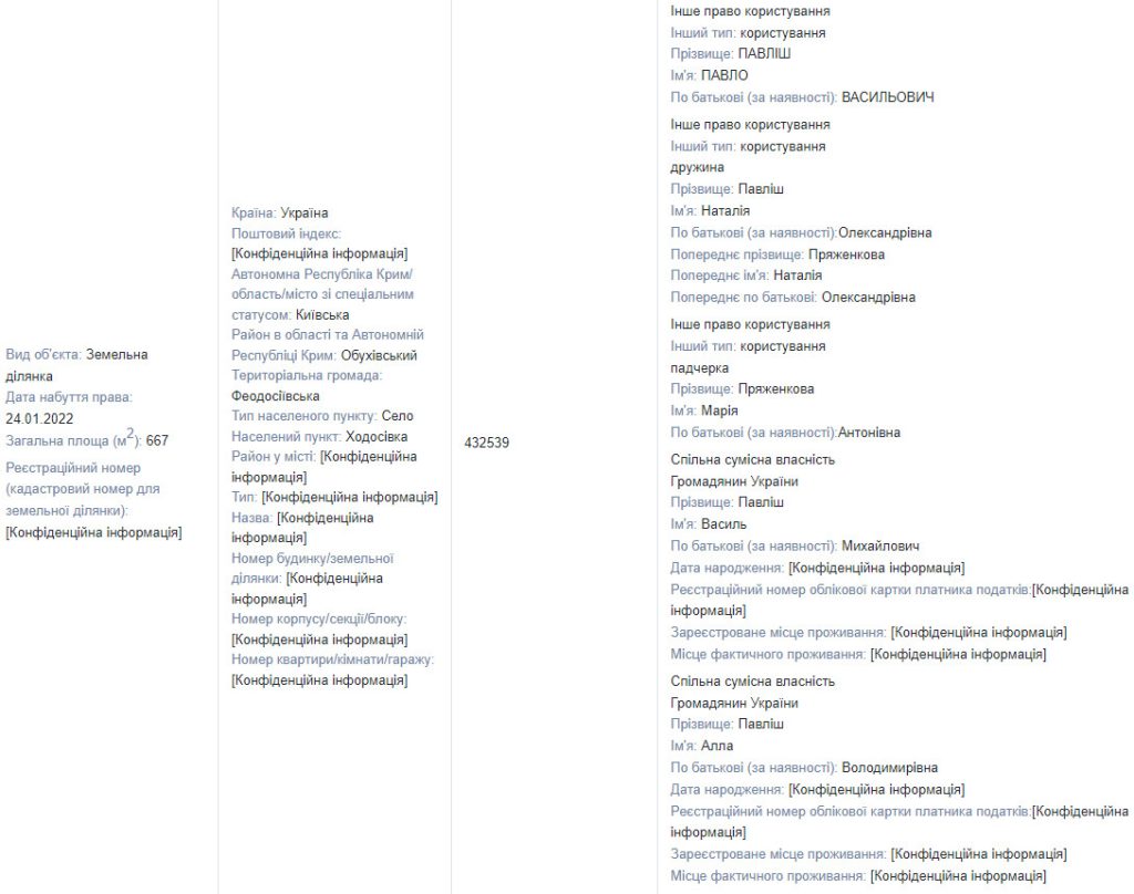 Площа землі складає 667 квадратних метрів. Її оцінили у 432 тисячі 539 гривень.Разом з Павлішем користувачами і співвласниками землі є все та ж Наталія Павліш, падчерка Марія Пряженкова, Василь і Алла Павліши.