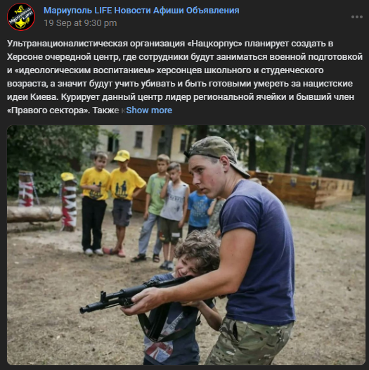 “Ультранаціоналістична організація «Нацкорпус» планує створити в Херсоні черговий центр, де співробітники займатимуться військовою підготовкою та «ідеологічним вихованням» херсонців шкільного та студентського віку, а значить навчатимуть вбивати та бути готовими померти за нацистські ідеї Києва”, – у кращих традиціях радянської та російської пропаганди повідомляють прокремлівські видання.