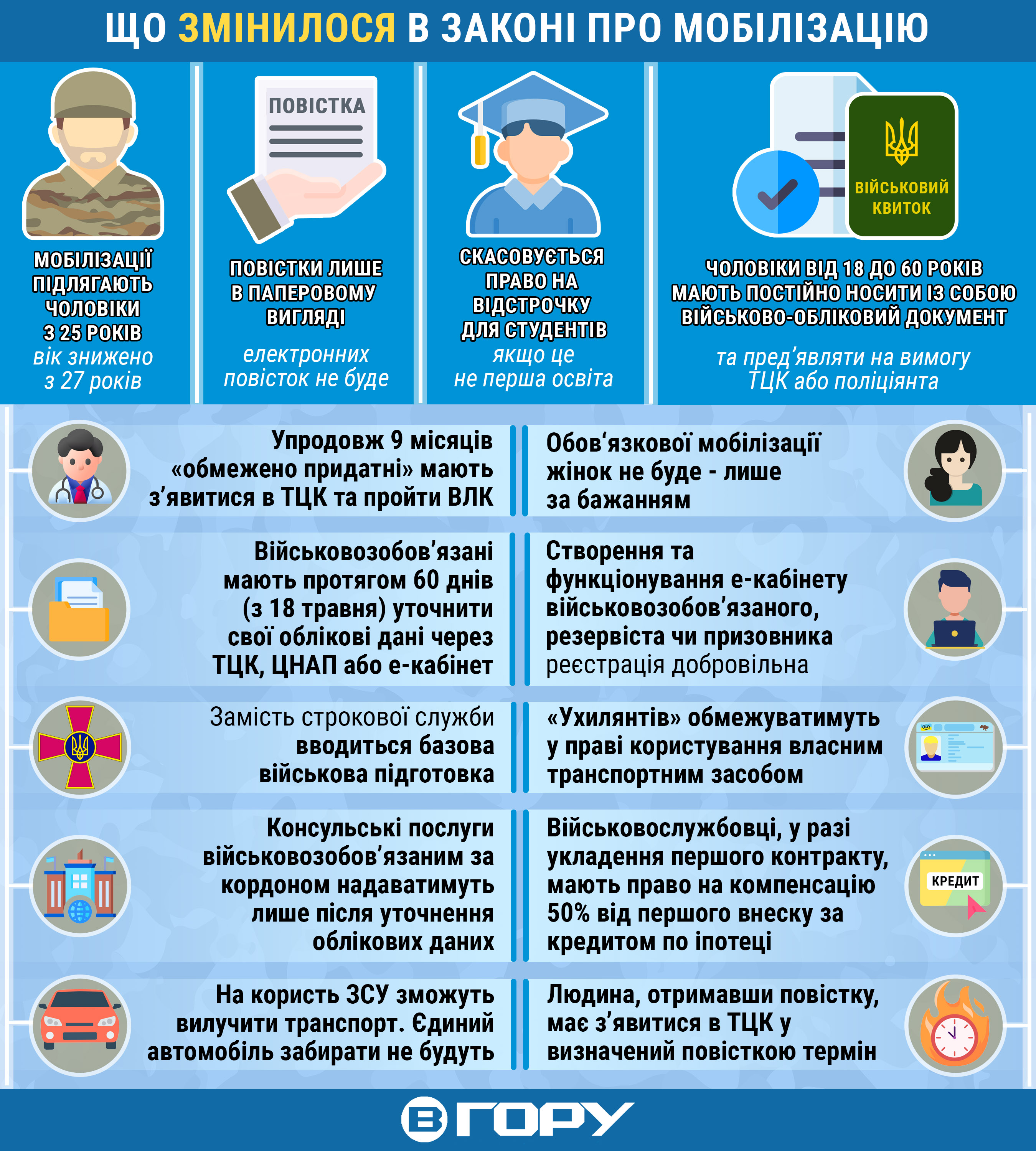 Новий закон передбачає певне посилення мобілізації в Україні (вік чоловіків, які підлягають мобілізації, знижено з 27 до 25 років) та більш прискіпливий військовий облік. Головне – за 60 днів, починаючи з 18 травня, абсолютно всі військовозобов'язані чоловіки (18-60 років) мають оновити й уточнити свої дані в Територіальних центрах комплектування та соціальної підтримки (ТЦК та СП), центрі надання адмінпослуг (ЦНАП) або в електронному кабінеті призовника, інакше автоматично вважатимуться ухилянтами.