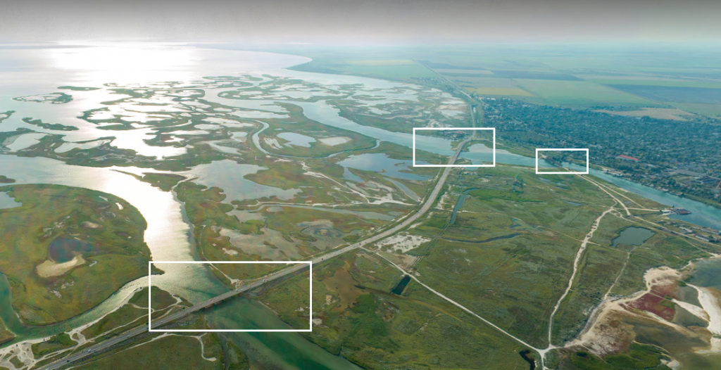 Вид на Генічеськ з боку Арабатської стрілки, прямокутниками відмічено мости через дві протоки, літо 2020 р. Фото: Google