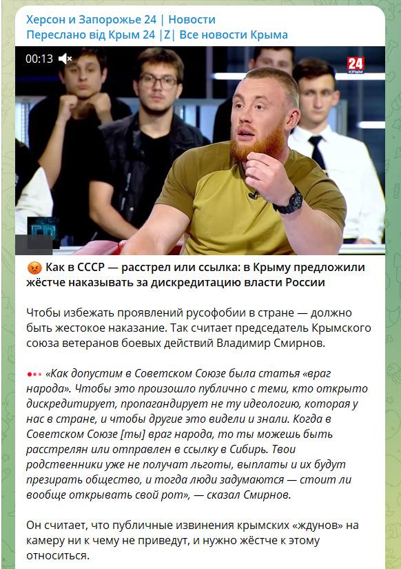 Розстріли і заслання в Сибір, а також санкції стосовно членів сім’ї – так карати людей, не згодних з політикою Кремля закликає «громадський діяч» з окупованого Росією Криму Володимир Смирнов, який очолює «Кримську спілку ветеранів бойових дій».Таку заяву від зробив в етері підконтрольного російським окупантам телеканалу «Крим 24», в програмі «Кажіть правду», яку також транслював телеканал «Херсон и Запорожье 24 | Новости», серед глядацької аудиторії якого – і мешканці окупованих територій.