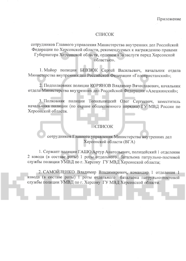 Окремої уваги заслуговують п’ятеро співробітників МВС РФ, які були рекомендовані до нагородження орденами «За заслуги перед Херсонською областю»: