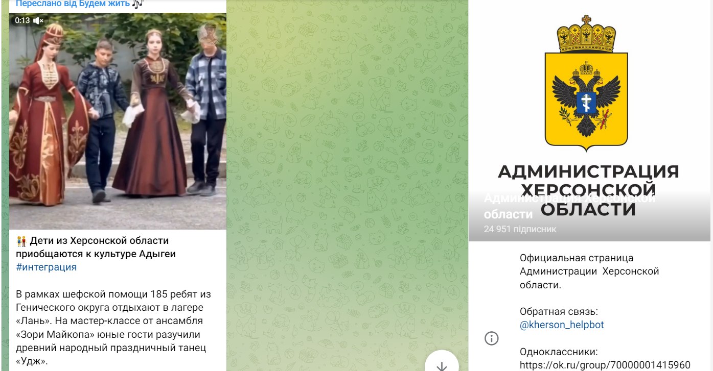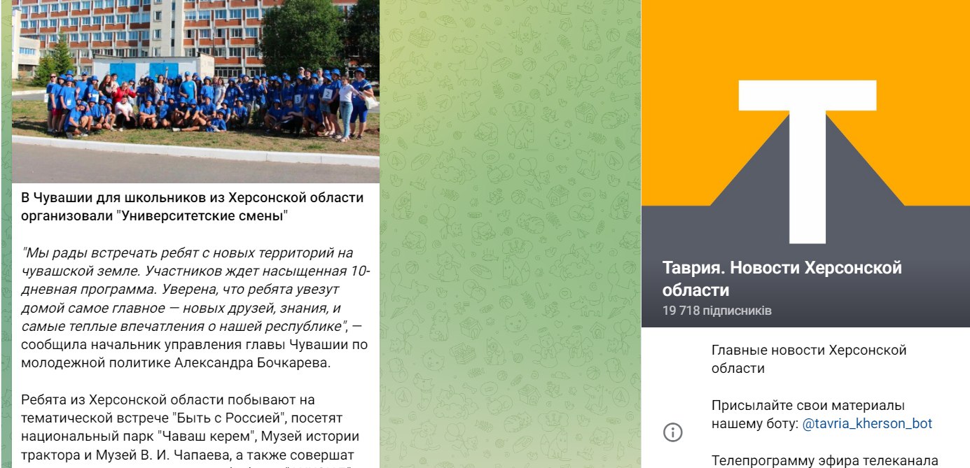Про рівень такого «відпочинку» свідчать матеріали на пропагандистських ресурсах, через які можна дізнатися, куди саме відправляють дітей з Херсонщини. А «відпочинок» для них організовують у найбільш депресивних регіонах РФ. Зокрема, згідно з репортажами прокремлівського ресурсу «Таврія», дітей з окупованої частини Херсонської області направляють, у Республіку Адигея, Кабардино-Балкарію та до Чувашії.Скріншоти з окупаційних Тelegram-каналів