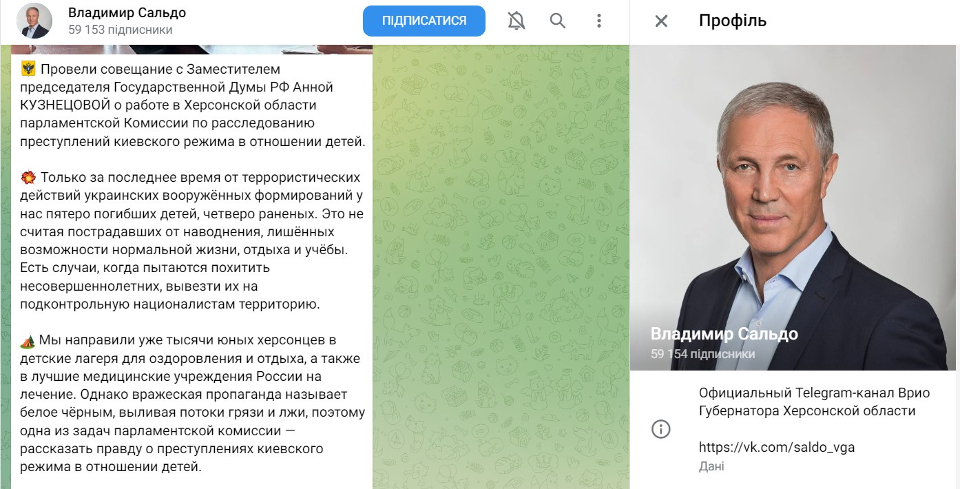 Діти на тимчасово окупованій частині Херсонщини і далі стають жертвами кремлівського режиму. Окупаційна влада продовжує їхню депортацію до РФ – чиновники так званої «адміністрації» називають це «оздоровленням та відпочинком».Нещодавно так званий голова окупаційної адміністрації області Володимир Сальдо заявив, що цього року до дитячих таборів Росії було відправлено вже тисячі дітей із Херсонської області.