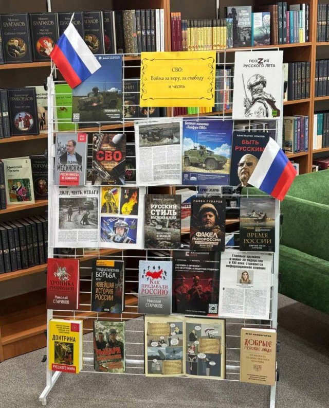 Окупаційну районну бібліотеку у Генічеську відвідав пропагандист Олег Глушко, який від імені Союзу журналістів Росії «передав у подарунок книги письменників Донбасу». Та серед них на фото чомусь бачимо книгу «Украинский рубеж» Наталіі Нарочніцкой - екс-депутатки Держдуми РФ, яка до Донбасу не має жодного стосунку. Доктор історичних наук, спеціаліст з США і Німеччини, як вона себе називає, свого часу була членом «комісії з протидії спробам фальсифікації історії на шкоду інтересам Росії при Президенті Російської Федерації». Яку «історію» розповідає вона у книзі, думаємо, пояснювати не треба. «Автор впевнена, що перемога буде на боці християнського, традиційного, справедливого російського світу», - написано в анотації. Тобто, генічеських дітей змушуватимуть читати маячню російської фашистки.А у Новотроїцькій бібліотеці колаборанти організували книжкову виставку «СВО: війна за віру, свободу і честь». «На заході читачі ознайомились з новинками книжкового фонду», - повідомила у соцмережі окупаційна адміністрація. Серед «новинок» - «Факел Новороссии» колишнього члена неонацистського «Русского национального единства», самопроголошеного «губернатора» Донецької області і майбутнього в’язня Гааги Павла Губарева та «Доктрина русского мира», написана Прохановим, Дугіним та іншими російськими фашистами.