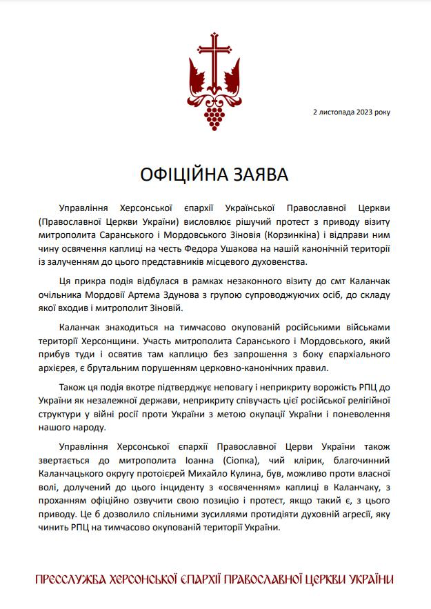 Управління Херсонської єпархії ПЦУ висловило протест проти візиту митрополита Саранського та Мордовського Зіновія (Корзінкіна) на окуповану територію України та освячення ним у смт Каланчаку каплиці Федора Ушакова.Про це повідомляє пресслужба Херсонської єпархії ПЦУ.“Ця прикра подія відбулася в рамках незаконного візиту до смт Каланчак очільника Мордовії Артема Здунова з групою супроводжуючих осіб, до складу якої входив і митрополит Зіновій”, – зазначають у єпархії.