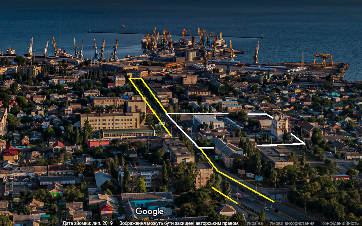 Територія автовокзалу(відмічено білим кольором) і Західний проспект(жовтим кольором) у Бердянську, липень 2019 р., джерело фото Google