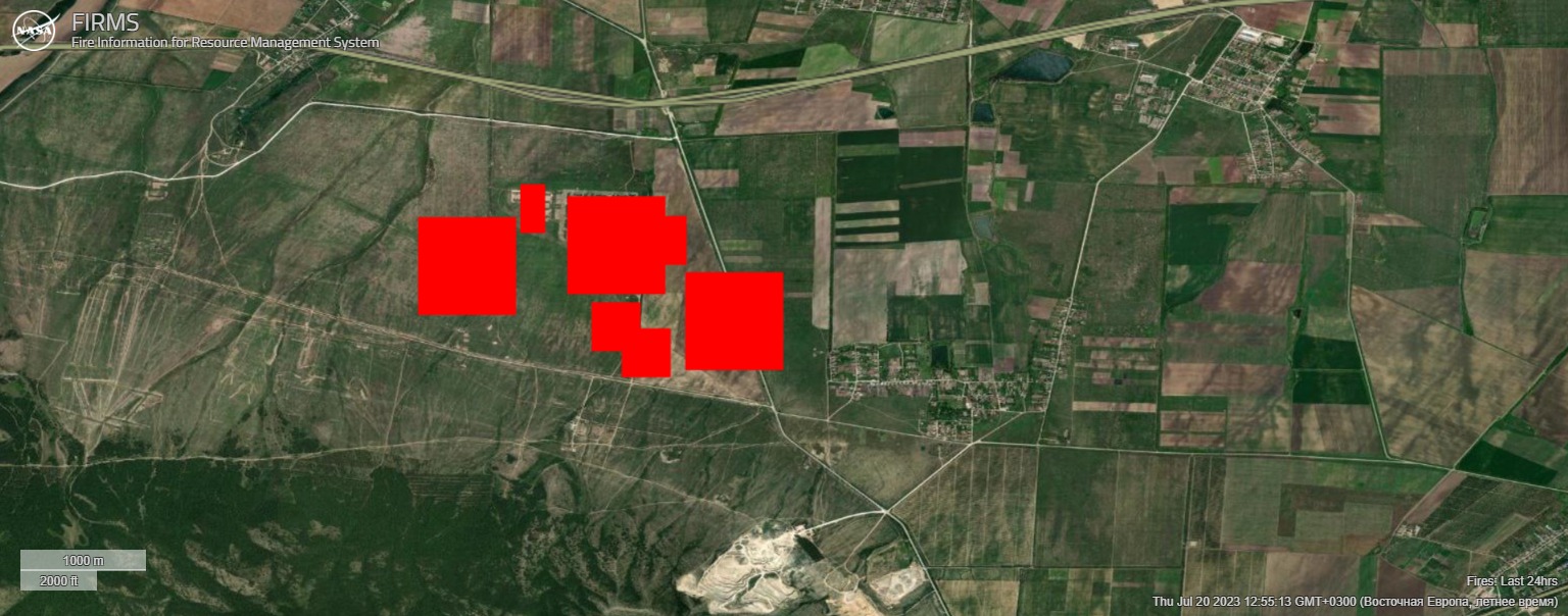Пожежі на місці «бавовни» на Старокримському полігоні у Криму. 19.07.2023. Фото: FIRMS NASA