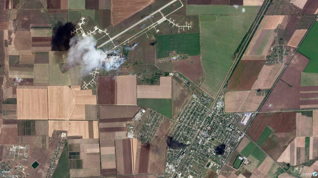 Супутниковий знімок Planet Labs вибухів на складі боєприпасів на Октябрському аеродромі та пожежі в сусідньому містечку. Фото: twitter.com/hwtnv