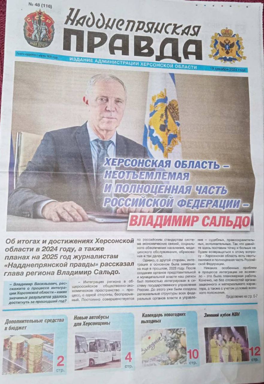 Першу, шосту і сьому шпальти агітки «Надднепрянская правда», яку друкують у «віджатому» видавництві «Таврида» у Сімферополі, окупанти віддали під інтерв’ю з намісником Путіна на окупованій Херсонщині. Інтерв’ю зі зрадником Сальдо називається «Херсонська область – невід’ємна і повноцінна частина Російської Федерації». Брехня там не лише у заголовку, «губернатор» на ходу вигадує, що окупаційною владою було і буде зроблено у регіоні. Бреше і про правобережжя. Ось цитата: «Деякі частини ЗСУ перекинули з Херсонської області на курську авантюру, у ворога недостатньо солдатів на Херсонському напрямку… Але ворог постійно готується до нашої висадки. Тому що він знає: коли-небудь Херсон точно буде звільнено». Розповів Сальдо і про те, як окупаційна влада відбирає майно тих, хто змушений був виїхати з окупованого лівобережжя: «Зараз у Херсонській області активно складають список майна, яке підлягає націоналізації». Хоча і без списків окупанти вже зайняли порожні домоволодіння. «Плануємо розвивати економіку, продовжувати оновлення автомобільних доріг і завершити процес інтеграції у всі сфери життя країни», – збрехав наостанок «губернатор».