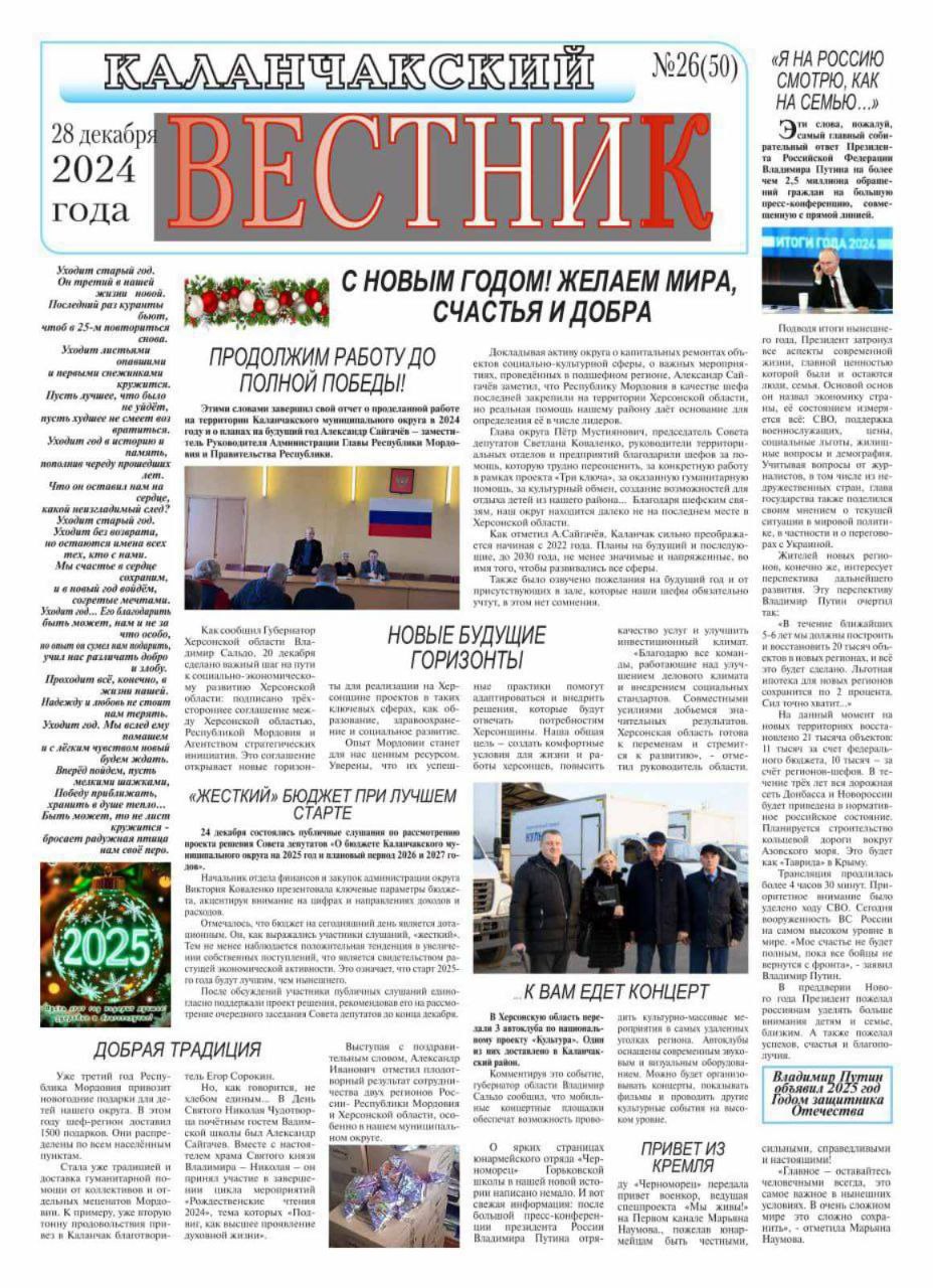 «Каланчакский вестник», яку друкують на обладнанні окупаційної адміністрації у Каланчаку, на першій шпальті захоплюється своїм Путіним, який під час «прямої лінії» назвав Росію сім’єю і сказав, що не буде повністю щасливим, «поки всі бійці не повернуться з фронту». «З початком Спеціальної військової операції відкрились нові можливості для тих, хто своїм життєвим орієнтиром вважає допомогу, підтримку і співчуття», – брешуть пропагандисти у статті «Добро і співчуття не просто слова». Хоча у фашистській Росії навіть понять таких нема.Богдан СТРАЖАК, Новий День