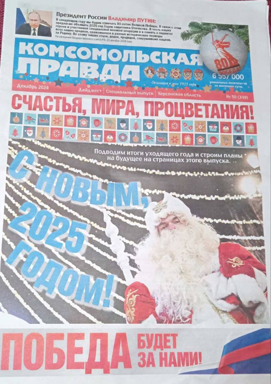 «Комсомольская правда. Херсонская область», яку друкують на захопленому обладнанні у друкарні Мелітополя, традиційно починає з цитати Путіна на першій шпальті, де він ставить в один ряд нинішніх російських фашистів і тих, хто боровся з фашизмом під час Другої світової. Незважаючи на свято, агітка настільки просякнута мілітаризмом, що навіть візит Діда Мороза у дитяче відділення окупаційної районної лікарні у Генічеську називається «новорічною спецоперацією».