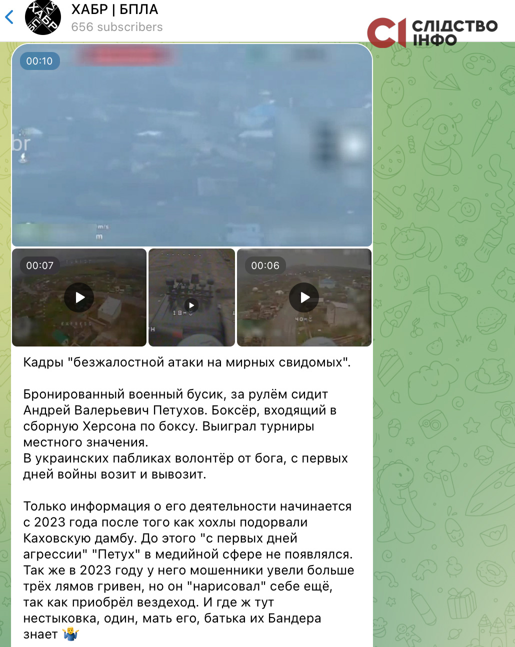 Увагу журналістів привернув телеграм-канал «ХАБР_БПЛА», який ймовірно ведуть бійці однойменної групи 18-ї окремої мотострілецької бригади угруповання військ «Дніпро» Російської Федерації. Тут регулярно і першими зʼявляються кадри, як FPV-дрони атакують цивільних на правобережжі Херсонщини. По автівці волонтера Андрія, ймовірно відпрацювали бійці ХАБР 18-ї бригади армії РФ.