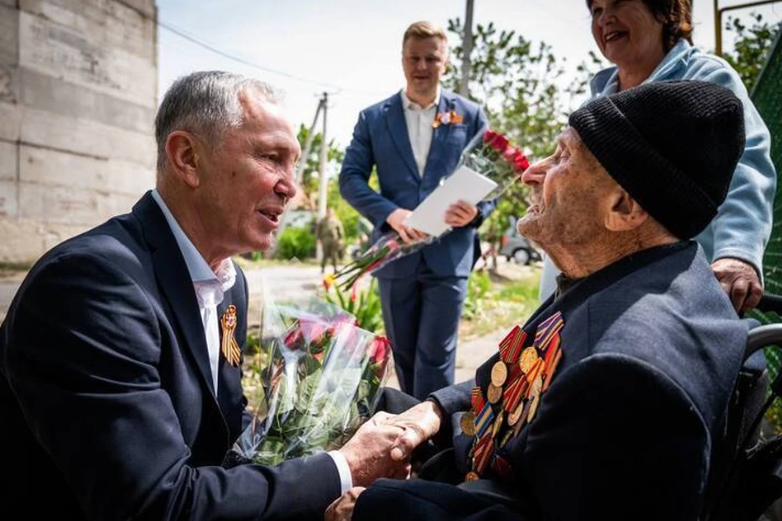 Колаборант Володимир Сальдо та останній ветеран Семен Чумаченко, 2024 рік. Фото: російські медіа.