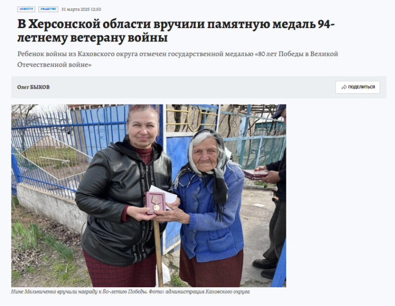 Росіяни вітають на лівобережжі Херсонщини “ветерана війни”, якій на початок Другої світової було 10 років