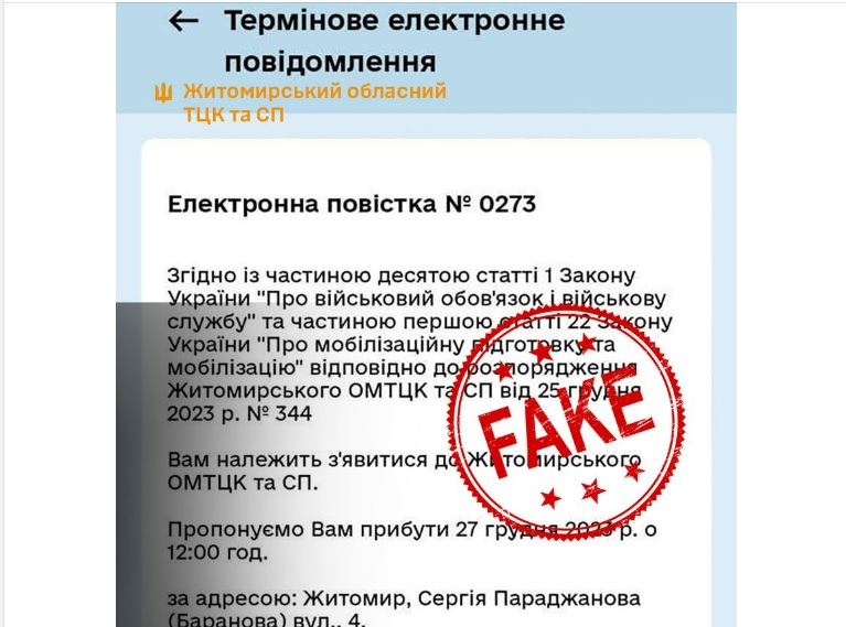 Житомирський ТЦК і СП спростовує фейк про електронні повістки.