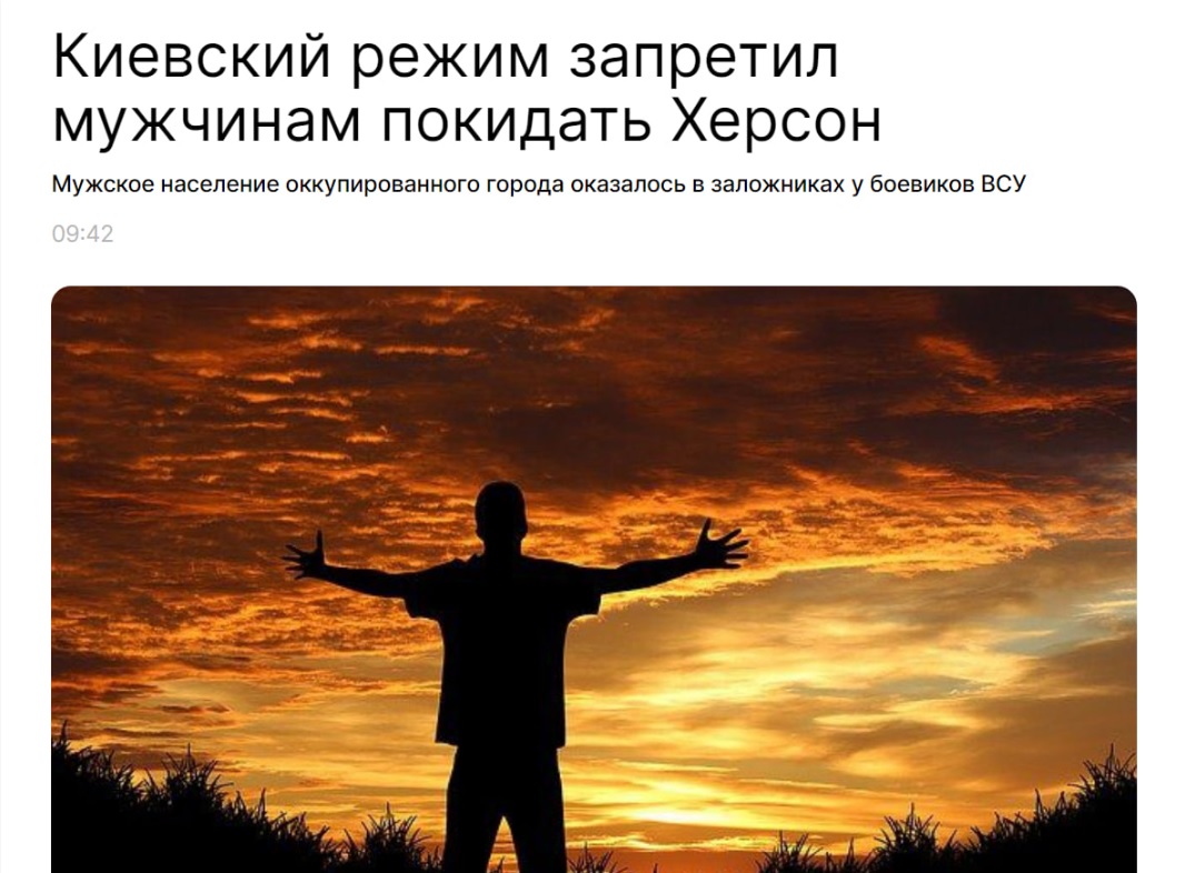 Через гостру нестачу чоловіків, повістки до військкоматів почали видавати неповнолітнім. Пропагандисти розповідають сльозливу історію про 14-річного херсонця, якого злі працівники військкомату намагались відправити на фронт. І лише Бог і Сальдо знають, скільки разів хвора уява російських журналістів ще мобілізовуватиме з Херсона усіх чоловіків і хлопчиків.