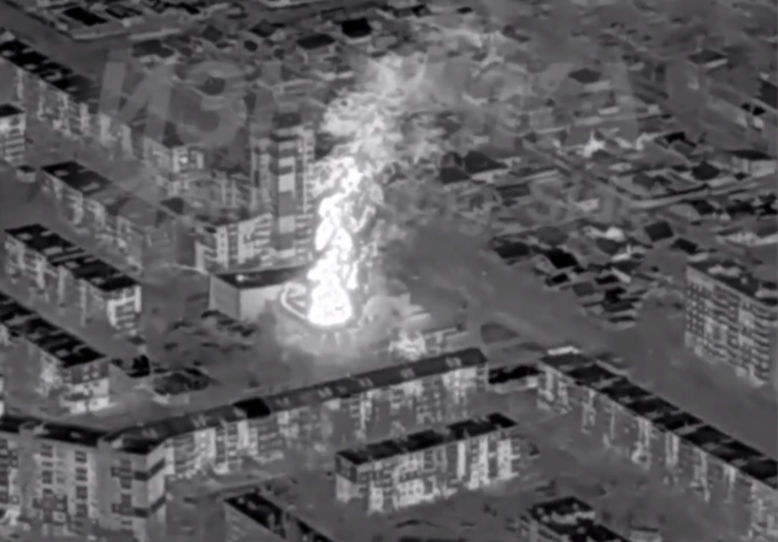 Пожежа в кінотеатрі Херсона, зафільмована російським розвідувальним дроном. Детонація БК не спостерігається.