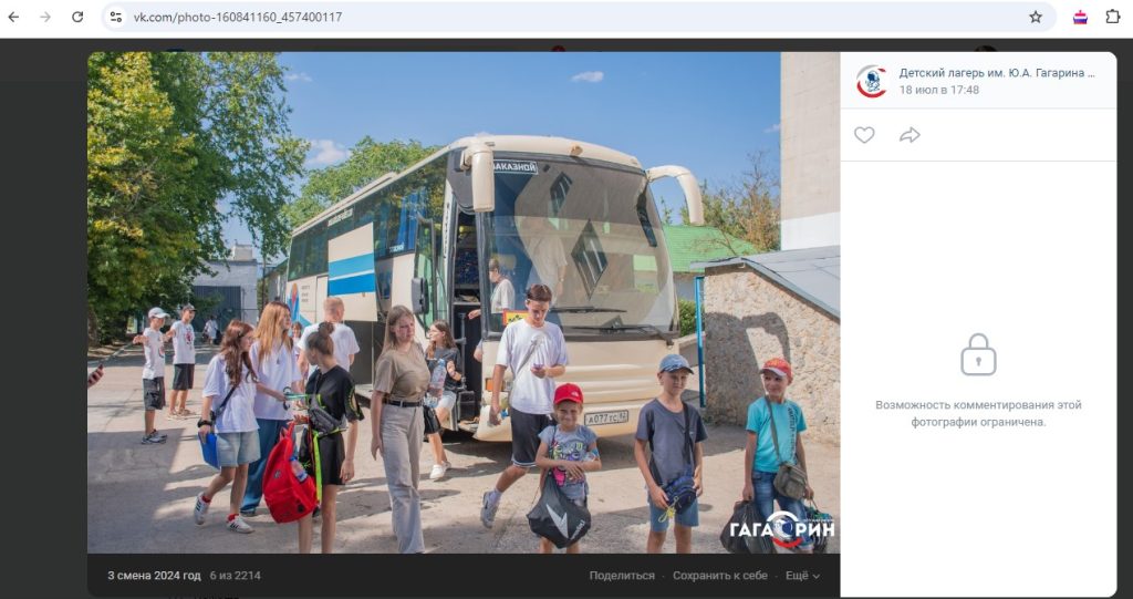 Волонтери команди OSINT-напрямку Центру готовності цивільних фонду Сергія Притули знайшли осіб, які надавали ресурси та безпосередньо брали участь у вивезенні 200 дітей Херсонщини до табору імені Гагаріна 17 липня 2024 року. Зміна тривала 21 день.