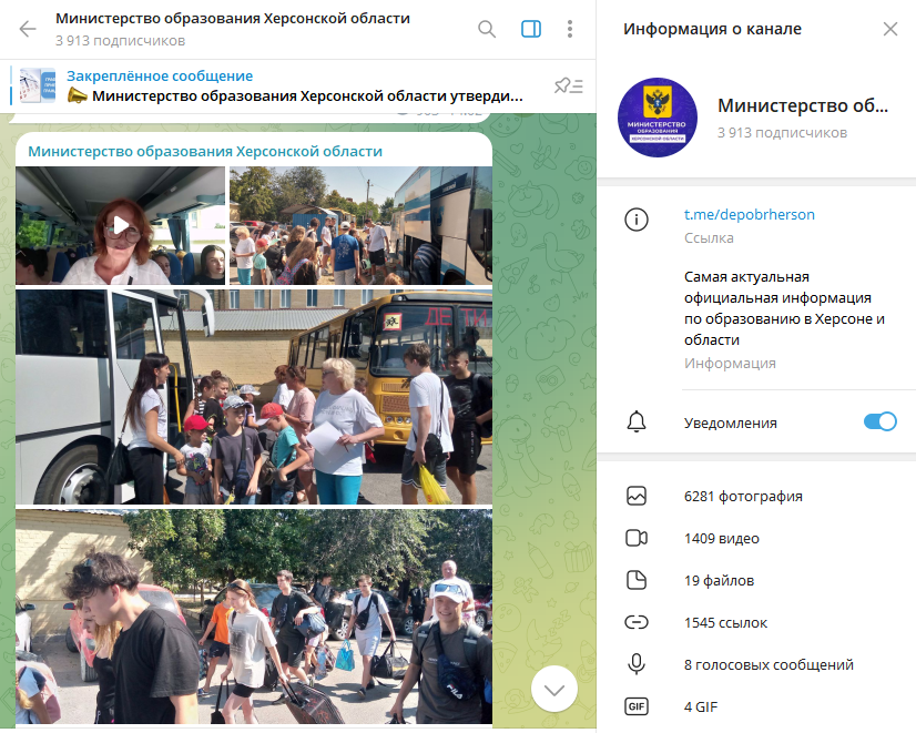 Самопроголошене Міністерство освіти Херсонської області у своєму Telegram звітувало про оздоровлення місцевих дітей протягом літнього періоду. До прикладу, 17 липня 2024 року 200 школярів із Херсонської області вирушили до дитячого табору в Євпаторії, на підконтрольній РФ території. Чи всі діти повернулися до своїх родин — наразі не встановлено.