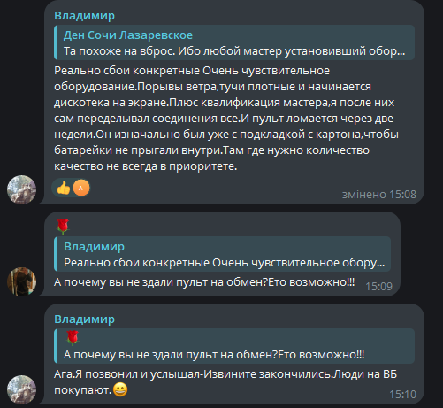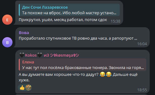 Херсонці вказують, що безплатне супутникове обладнання є дуже метеочутливим і навіть невеликий вітер створює перешкоди для сигналу. Цікаво, що без оплати “Русскій мір” отримали лише ті, хто погодився на заміну віддати свої старі, більш якісні супутникові тарілки. У кого ж їх не було, мали заплатити за “безплатне” телебачення кругленьку суму в рублях.Місцеві колаборанти також скаржаться на жахливу якість комплектів та швидкі поламки пультів і тюнерів. “Рекордсмен” серед таких комплектів, наприклад, пропрацював всього дві години. В середньому ж “Русскій мір” припиняє виконувати свої функції вже за кілька місяців після встановлення.