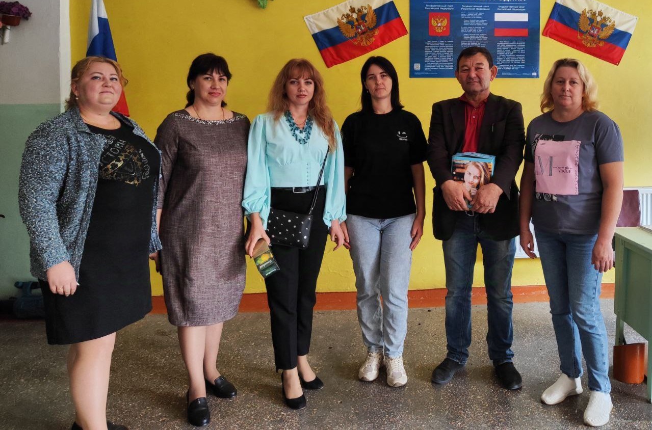 Колаборант Аброрбек Дехконов (другий праворуч) у школі в Архангельській Слободі, жовтень 2024 року. Фото з окупаційних пабліків