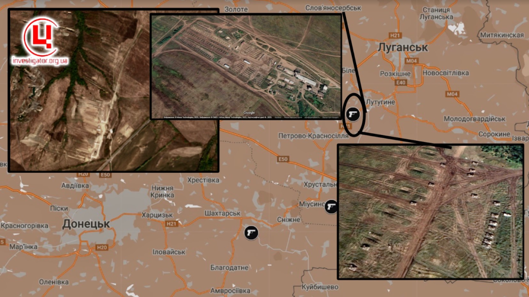 Фото: супутник Sentinel-2; Колаж: investigator.org.uaОстанній полігон рашистів на Донбасі, який трапився на очі, – за 20 км на південь від Луганська, с. Мирне Лутугинської міської громади, де за даними перепису населення України 2001 року проживали 5 осіб.