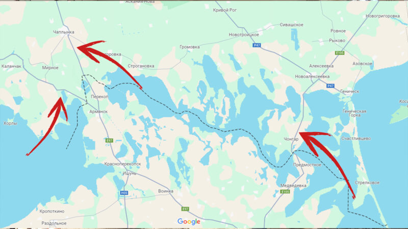 А тепер невеличкий урок географії. Херсонську область і Крим сполучають три великі траси через Чонгар, Каланчак та Чаплинку. На цих шляхах у період з 2014 по 2022 діяли українські КПВВ. Іншої автомобільної дороги на окупований півострів немає. Навіть якщо росіяни вирішать її побудувати, на це доведеться витратити купу ресурсів, адже регіони розділяє озеро Сиваш. Окрім дороги, у такому випадку, доведеться будувати ще й додатковий міст, що навряд чи входить в плани окупантів.