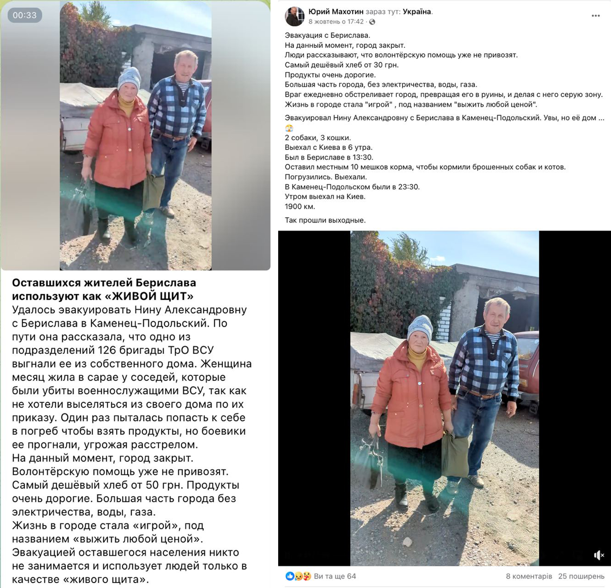 Насправді пропагандисти переробили повідомлення від волонтера в групі «Берислав і район OnLine», який допомагав вивозити жінку. Це Юрій Махотін, саме він опублікував відео, яке використали пропагандисти. Волонтер вивіз жінку з двома псами та трьома котами до Кам'янця-Подільського, де на неї чекала донька.