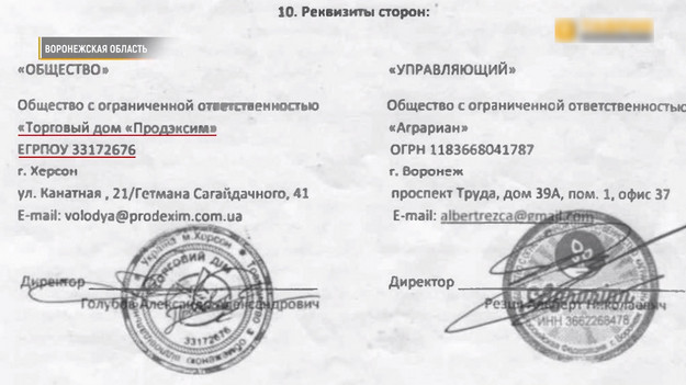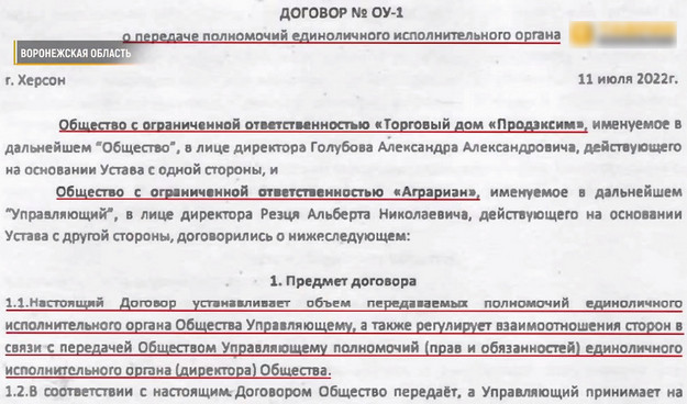 Крім цього, пропагандисти заявили, що Резці свій бізнес нібито передав сам Колихаєв. При цьому вони показали фрагменти договору про передачу під контроль “Аграріан” фірми «Торговий дім “Продексім”», який датований 11 липня 2022 року і підписаний Олександром Голубовим.