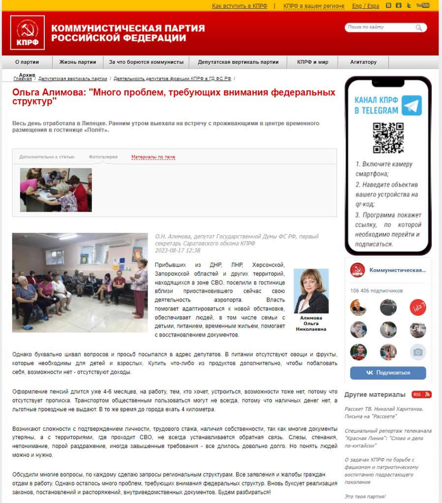 Погане харчування, неможливість влаштуватися на роботу або оформити пенсію, безліч інших проблем: так живуть мешканці Херсонської області, які опинилися в російському місті Липецьку, і зараз живуть в пункті розміщення в готель «Політ», розташованому за межами міста. Сайт КПРФ опублікував замітку про зустріч депутата держдуми РФ Ольги Алімової з людьми, які живуть в пункті тимчасового перебування.