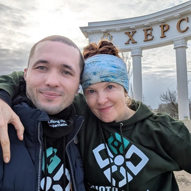 Волонтери ГО "Місто сили" Євген Гілін та Вікторія Єсауленко в Херсоні / фото надане Євгеном Гіліним