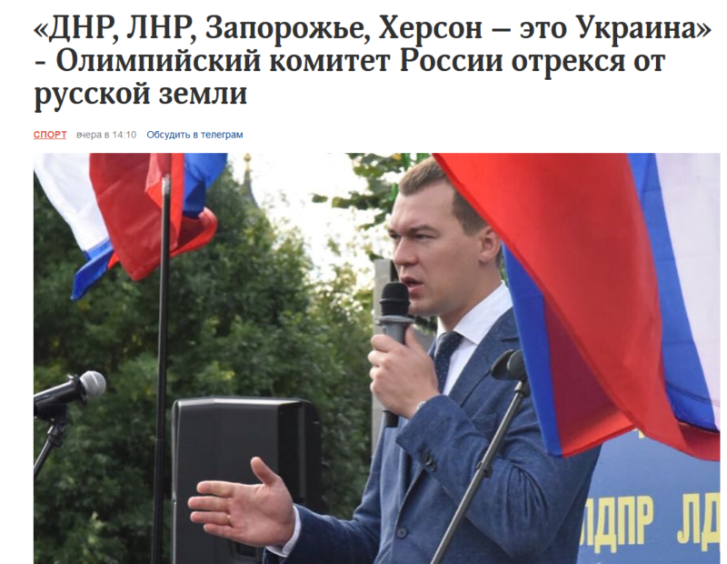 Намагаючись повернутись у міжнародний спорт, Олімпійський комітет Росії (ОКР) офіційно виключив зі свого складу представників “олімпійських рад” Херсонської та Запорізької областей, а також так званих “ДНР” та “ЛНР”. Річ у тім, що участь у змаганнях на цьому рівні спортсменів з окупованих територій України порушує Олімпійську хартію. На болотах відповідне рішення Міністра спорту РФ Міхаіла Дєхтярьова вже назвали “зрадою”, вважаючи, що таким чином російська влада “зреклась русскіх земель”.