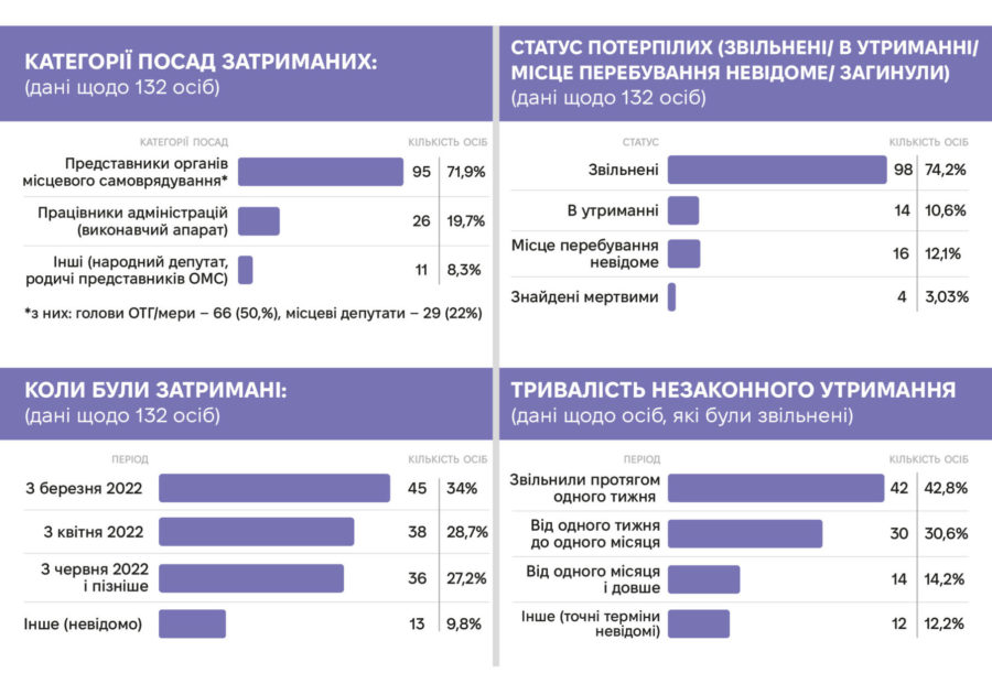 50% затриманих — голови ОТГ/мери міст, ще близько 22% — місцеві депутати. Більшість — а саме 98 посадовців — були звільнені. Все ще у полоні знаходяться 14 людей. Про долю 16 людей нічого невідомо. Четверо з викрадених, на жаль, були знайдені мертвими.