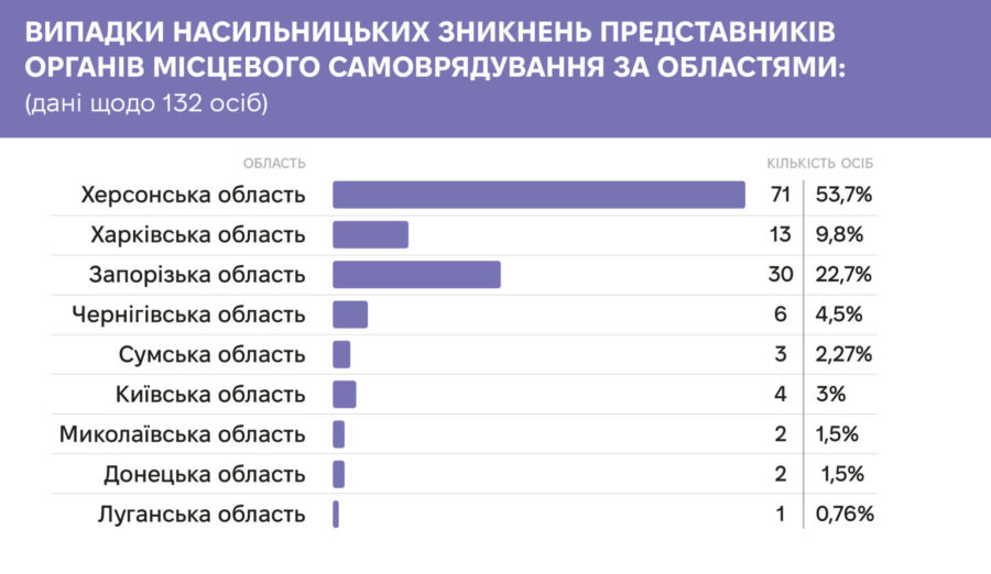 З початку повномасштабної війни росіяни викрали 132 представників українського місцевого самоврядування та органів влади. Більше половини викрадень (71 випадок) сталося на Херсонщині. Ще 30 випадків — у Запорізькій області. Про це повідомив Центр прав людини ZMINA 27 вересня під час пресконференції у Києві. Інформацію правозахисники збирали як під час опитувань потерпілих, так і з відкритих джерел.