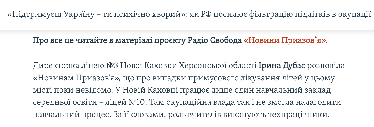 Підтвердження слів Ірини можна знайти й в інтерв’ю міського голови Нової Каховки Володимира Коваленка. В етері телеканалу "Еспресо” він каже, що “окупанти планували відкрити один клас на базі школи №10, але більшість батьків, які залишилися, вирішили не віддавати туди своїх дітей, проявивши здоровий глузд”. Загалом, він підсумовує: за два роки окупації в Новій Каховці жодна школа і жоден дошкільний заклад не працювали.Виконувачка обов’язків директора ліцею №10 Новокаховської міської ради Світлана Істоміна доповіла виданню Нова Каховка City, що “зараз десята школа в окупованій Новій Каховці офіційно працює, але директор та вчителі викладають за російською програмою з Генічеська онлайн”. Й саме на цю програму окупантам вдалося зібрати 82 дитини. Тобто, 82 родини отримають гроші, щоб якось вижити в умовах російської окупації.