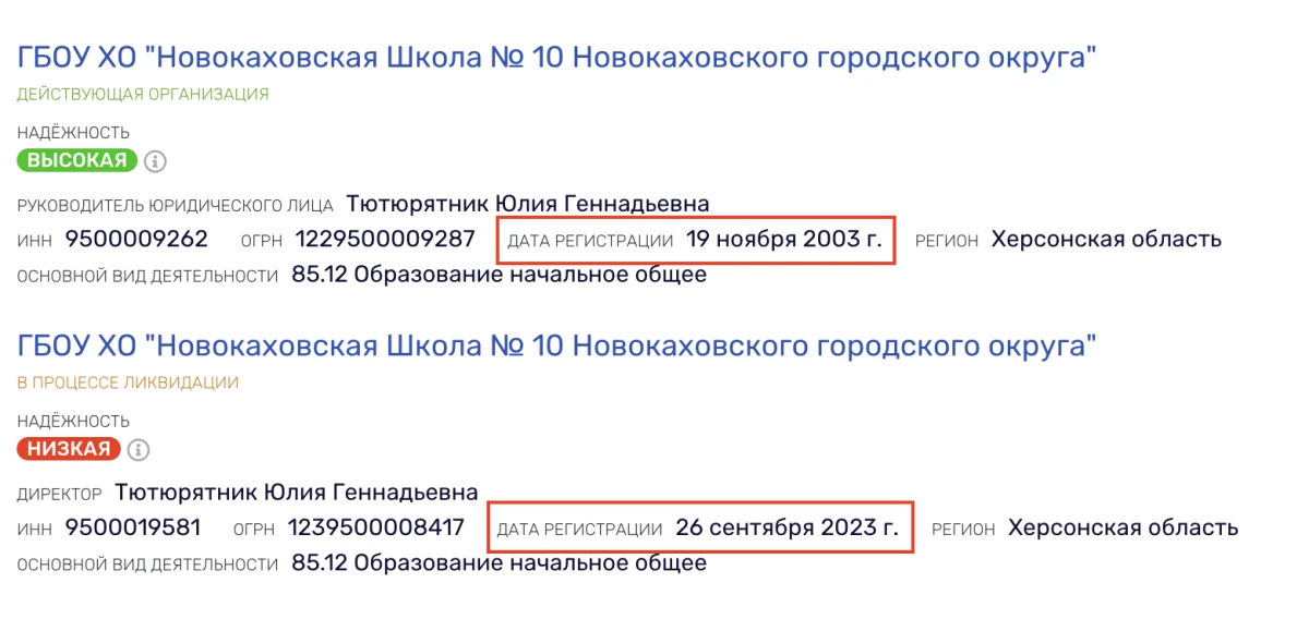 Як ми бачимо, “директором”, а вірніше “керівником юридичної особи” “школи №10” окупанти назначили колаборантку Юлію Тютюрятник – ймовірно, за те, що вона допомагала їм проводити незаконний референдум. Наразі окупанти перереєстровують заклади, використовуючи справжні дати заснування закладів замість дат, які вказують на окупацію – тобто, крадуть усе.