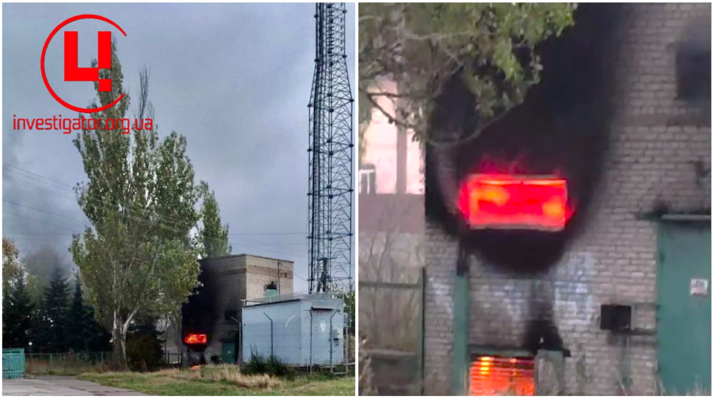 Пожежа на об’єкті енергетичної інфраструктури у селищі Урзуф, Донецької області. 20.10.2024. Фото: t.me/mrplSprotyv. Колаж: investigator.org.uaЦентр журналістських розслідувань