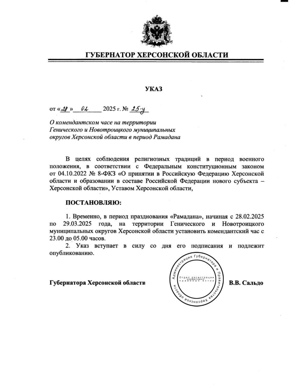 І окупанти вміло цей інструмент використовують. Аби показати, як він «поважає» почуття віруючих, наприклад, окупаційний губернатор Володимир Сальдо в останній день зими видав «указ» «Про комендантський час на території Генічеського і Новотроїцького муніципальних округів Херсонської області у період Рамадана». Вибір «округів» цілком зрозумілий: по-перше, там є мусульманські громади, а, по-друге, вони далеко від лінії фронту. Тому Сальдо «великодушно» дозволив їх жителям перебувати на вулиці з 5.00 до 23.00. Тобто, на годину більше – раніше комендантська година починалась о 22.00. «Указ» діятиме до 29 березня.