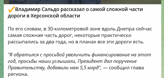 Але Сальдо лишається вірним своїм традиціям: він попросив ще понад п'ять мільярдів рублів для «ремонтів доріг» на Херсонщині на цей рік. Нагадаємо, що Херсонщина хоч і один із найтепліших регіонів України і тут дійсно ремонти доріг часто роблять доволі довго, але навіть у Херсонщині вже були перші «мінусові» температури. Тому як Сальдо витратить ще близько 57,2 мільйона доларів (саме стільки приблизно складає сума, яку він попросив у російського уряду) до кінця року за умови, що вже починаються холодні дні, невідомо.