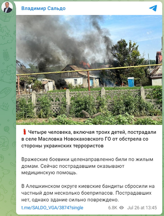 Голова окупаційної адміністрації області Володимир Сальдо збрехав про «обстріл» Маслівки на ТОТ Херсонщини.О 13:45 Сальдо написав (посилання веде на збережену копію допису, якщо він буде змінений, – ред.) у своєму Telegram-каналі про подію у Маслівці, де постраждали троє дітей та жінка. Він звинуватив Україну у цілеспрямованому обстрілі житлових будинків у селі.
