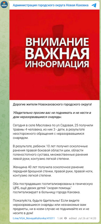 Але о 14:20 окупаційна адміністрація Нової Каховки написала (посилання веде на збережену копію допису, якщо він буде змінений, – ред.) у своєму Telegram-каналі, що вибух у Маслівці стався через необережне поводження зі снарядом, який не розірвався.