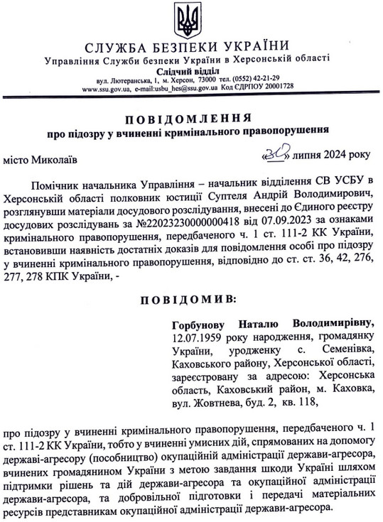 Служба безпеки України повідомила про підозру незаконній директорці водоканалу Херсона Наталі Горбуновій.Про це повідомляється на сайті Офісу Генерального прокурора.Горбуновій інкримінували пособництво державі-агресору. За інформацією слідства, спершу її призначили заступником директора з управління персоналом. Як стверджує слідство, 26 серпня 2022 року Наталю Горбунову призначили т. в. о. директора водоканалу Херсона.