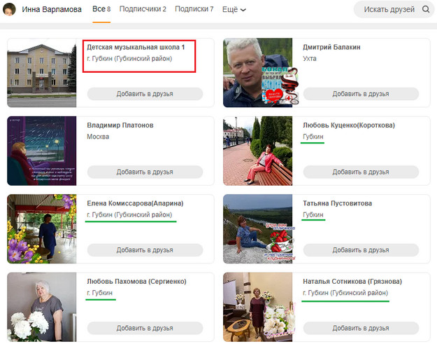 Інна ВарламоваВона може працювати у Дитячій музичній школі № 1. На це вказують наявність сторінки школи в друзях Інни Варламової та геолокація більшості людей звідти.