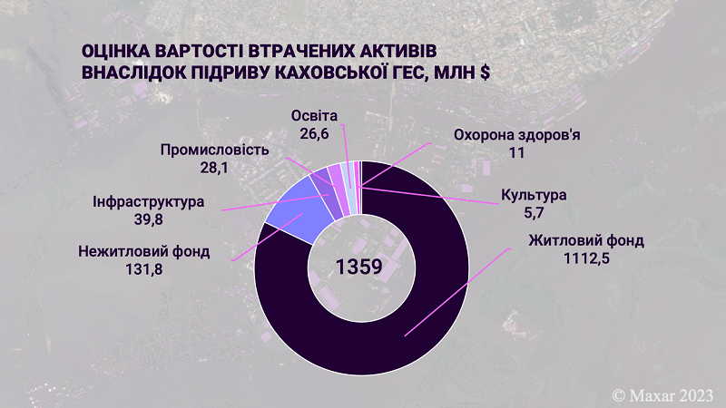 В результаті ми встановили, що пряма вартість фізичних активів, втрачених від підриву Каховської ГЕС, сягає щонайменше 1,36 млрд дол. Ця сума співставна з окремими траншами, які ми отримуємо від міжнародних партнерів – наприклад, у червні Світовий Банк погодив позику на 1,5 млрд дол. під гарантії Уряду Японії. Це чималі гроші, а для отримання кожного такого траншу Україна має виконувати досить багато вимог по реформах та зміні законодавства.