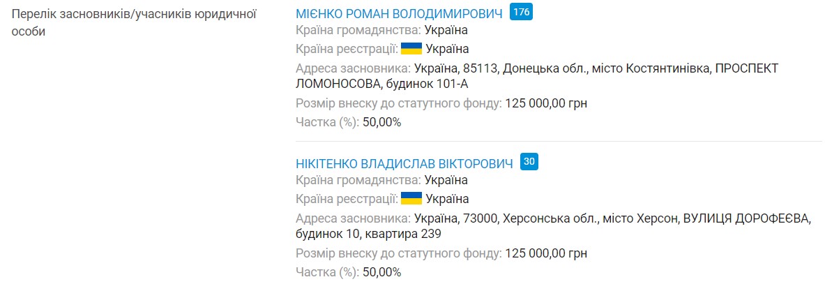 ТОВ "Екобудконсалт" навпіл належить Романові Мієнку та Владиславу Нікітенку. Скрин: Youcontrol