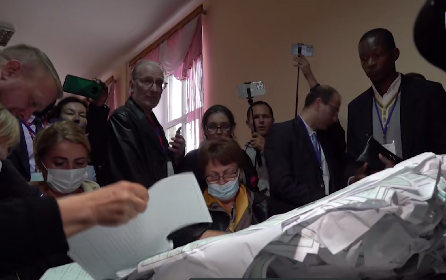 «Міжнародні спостерігачі» на «підрахунку» голосів у дільничному виборчкомі, створеному окупантами у Херсонському ліцеї №31 під час «референдуму», вересень 2022 року. Фото: скріншот відео окупаційних ЗМІ